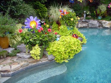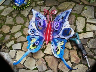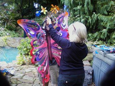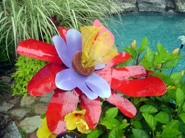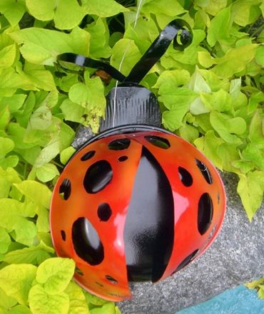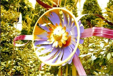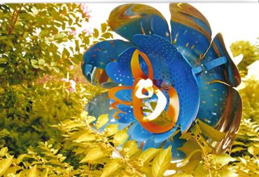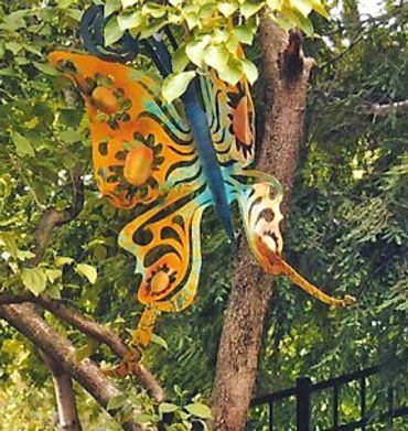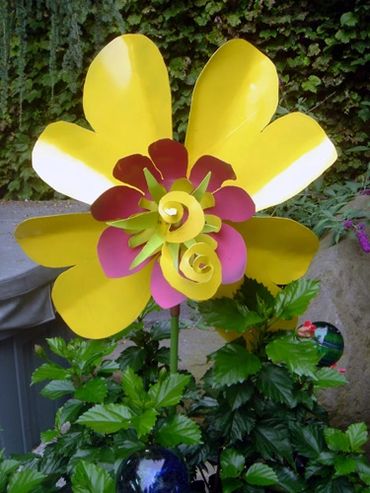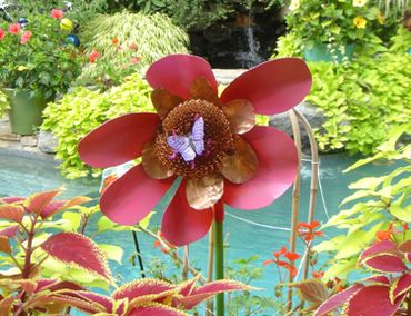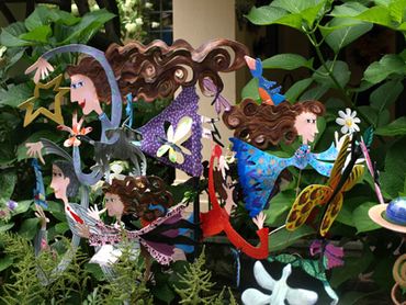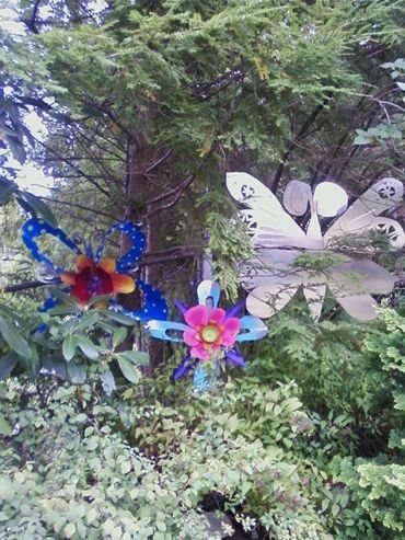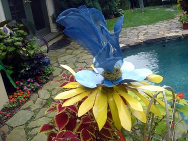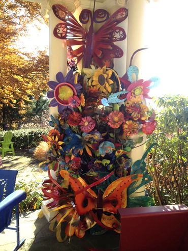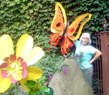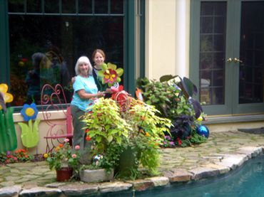 Nestled on a hillside looming above the Hudson with a distant view of the GW bridge, is the bucolic garden of Gary and Denise Rosenberg. Long time patrons of Karen's work, Gary and Denise have many fine pieces of her sculpture, including a chuppah which has graced two of their daughter's weddings as well as Denise's mother's batmitzvah. Last April, Denise asked Karen's advice on refreshing the garden sculptures of flowers, gazing balls, and sculptural chairs. Denise was afraid she might need to toss the existing metal art and start anew. Karen's solution was a trip to Home Depot for new paint, and what was old became new again! For Denise and her landscape designer, Marjorie Schutz, the garden is a job that is never done. So after months of making prototypes and sending Denise photos to find out what she liked, Karen loaded her clunker with various flowers and butterflies on a crisp September Tuesday and headed south. Still young enough to jump like a billygoat around the steep property, Karen moved lady bugs and flowers to various spots until they found their permanent homes. It was a splendid day for all. New pieces were discussed, so stay tuned for more photos in next month's newsletter.