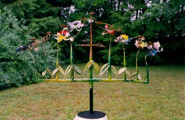 My father had taken me to Petersen's Hardware to introduce me to the world of copper tube and plumbing fittings. When Susan asked me to create a menorah, the only way I could imagine fabricating it was from the copper tube. I had taken a workshop with a metal smithing workshop with Heike Seppa, and learned to silver braze copper cones. By the time I'd finished connecting all the pieces, it was at least 5 feet wide and 3 feet tall!