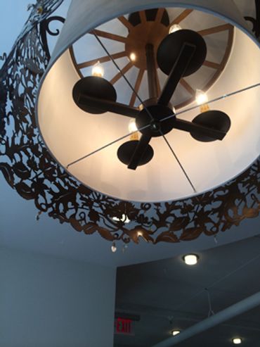In the same manner - the design for the lamp was made to tell the story of the camp. The leaves speak of mother nature's embrace which the campers so enjoy (at other times they represent the flurry of campers), and the charms that were added tell the story of the camp experience. If you look closely, you'll see that there are many bugs and insect charms but also hearts, music notes, cowboy boots, drama masks, stars, and a variety of other charms. Especially hearts with the word love in them- which goes back to that wonderful little painting left at the stairs to the tree house: love 'n hugs!
