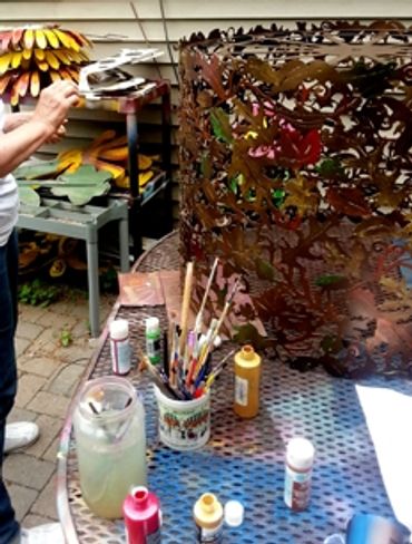 The campers enjoyed choosing characters to create their very own Fanciful Flights TM . First they painted the metal shapes of the Flights, and then they chose charms and trinkets to tell the story of their character. The charms were attached with beads and wire. Many times they made "self portraits," sometimes they made gifts for loved ones.