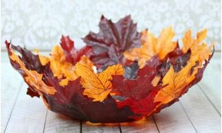 Collect different shapes, sizes and colors of leaves. Use ModPodge to glue the leaves together onto a plastic bowl covered with plastic wrap. After the piece dries, you'll be left with a great decorative bowl for fall.